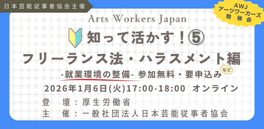 ニュース 🔰知って活かす!⑤ フリーランス法【ハラスメント等編】オンライン勉強会 #2 #ニュース 一般社団法人日本芸能従事者協会が主催する勉強会のお知らせです。HAUSの羊屋白玉がコメンテーターとして登壇します。申し込み・詳細はこちらをご覧ください。【開催概要】■ 日時:2026年1月6日(火)17:00〜18:00■ 形式:オンライン■ 参加費:無料・要予約■ 申込方法:このPeatix ページよりお申し込みください。【ご説明者】厚生労働省 雇用環境・均等局参事官(雇用環境政策担当)山口了子【第1部:解説(厚労省執行の4項目)】■ 第12条:募集情報の的確表示求人・募集時の情報を正しく伝える義務。仕事内容・報酬・期間などを誤解が生じないよう明確にすることが求められる。■ 第13条:育児・介護等への配慮継続的な取引関係で(6ヶ月以上など)、妊娠・出産・子育て・介護等で困難が生じた際に、スケジュール調整など合理的な範囲での配慮を行う義務。■ 第14条:ハラスメント対策(相談体制の整備)フリーランスに対するハラスメントを防止するための配慮義務。事業者は相談窓口の設置など、適切な対応体制の整備が求められる。■ 第16条:中途解除の事前予告・理由の開示6ヶ月以上の業務委託の場合、30日前までの予告をしなければならない。【第2部:質疑応答】参加者から事前にいただいたご質問およびび当日のチャット質問にお答えします。【ファシリテーター】森崎めぐみ(俳優/日本芸能従事者協会)【コメンテーター】 深田晃司(映画監督/全国芸能従事者労災保険センター・フリーランス安心ネット労災保険副理事長)、羊屋白玉(演出家/全国芸能従事者労災保険センター・フリーランス安心ネット労災保険安全衛生委員/Hokkaido Artist Union Studies(HAUS))/一般社団法人日本モデルエージェンシー協会/協同組合日本シナリオ作家協会